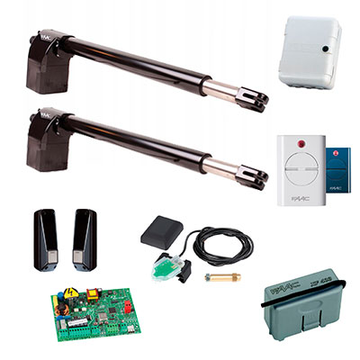 Привод 414 SX и DX - 2 шт., корпус "Е", плата управления, энкодер SAFECODER - 2 шт., радиоприемник, брелок передатчик - 2 шт., фотоэлементы.