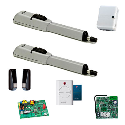 Привод 415 LS - 2 шт., корпус плат управления, плата управления, радиоприемник, брелок передатчик - 2 шт., фотоэлементы.